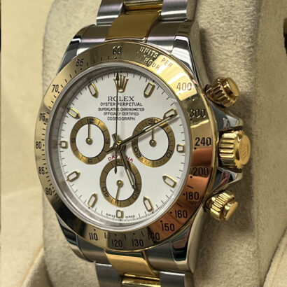 The Rolex Cosmograph Daytona (116523) boasts a 40mm case crafted from a combination of steel and yellow gold. Its sleek black dial is adorned with gold-toned sub-dials and hands, embodying both style and precision. The two-tone Oyster bracelet enhances its luxurious appeal while providing comfort and durability. Designed for speed and performance, this Daytona is a true symbol of excellence.