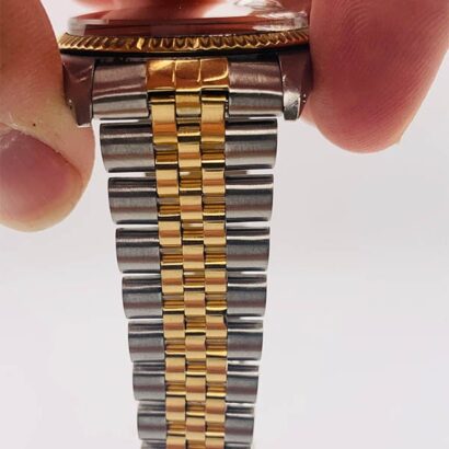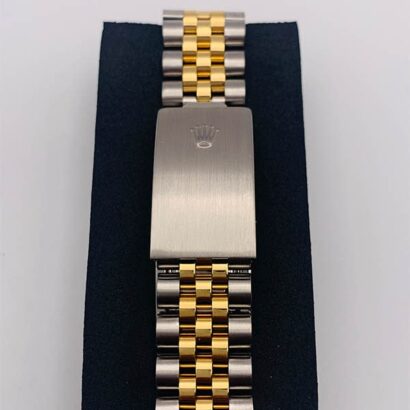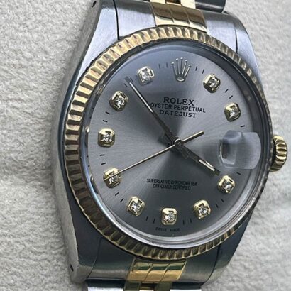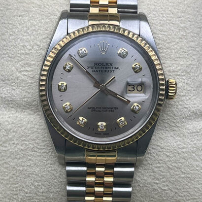 The Rolex Datejust (16013) features a 36mm steel and yellow gold case paired with a matching fluted yellow gold bezel. Its silver dial is set with diamond numerals and a date window at 3 o’clock, magnified by a Cyclops lens for enhanced visibility. The two-tone Jubilee bracelet offers a blend of elegance and comfort, completing the refined look of this timepiece.