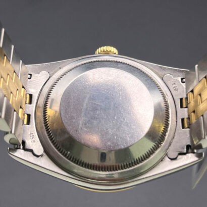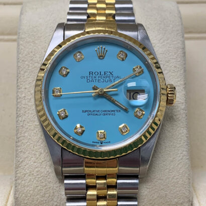 This Rolex Datejust (16233) features a 36mm steel and yellow gold case, complemented by a matching yellow gold fluted bezel. Its blue dial showcases gold-toned hands and elegant diamond hour markers framed in gold. A date window at 3 o’clock, magnified by the signature Cyclops lens, adds a touch of practicality to the design. Completing the look is a stylish two-tone Jubilee bracelet crafted from steel and yellow gold, secured by a steel fold clasp.