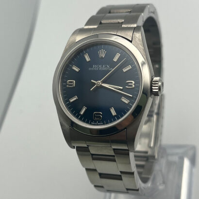 The Rolex Oyster Perpetual (77080) features a 31mm steel case complemented by a matching smooth bezel. Its salmon dial showcases metallic hands and hour markers with luminous elements for improved low-light visibility, as well as metallic Arabic numerals at 3, 6, and 9 o’clock. Completing the look is a stylish Oyster bracelet secured by a branded fold clasp.